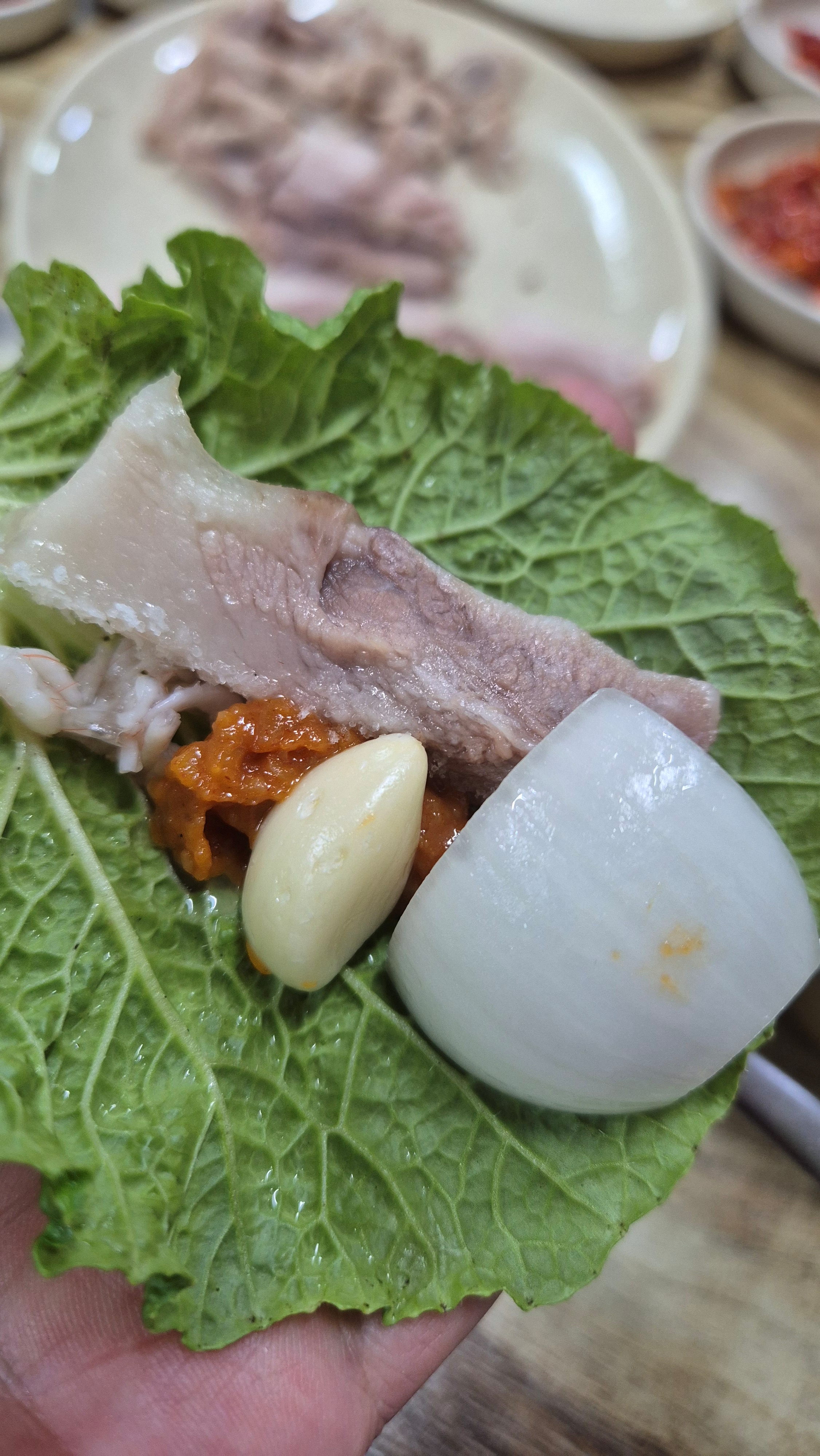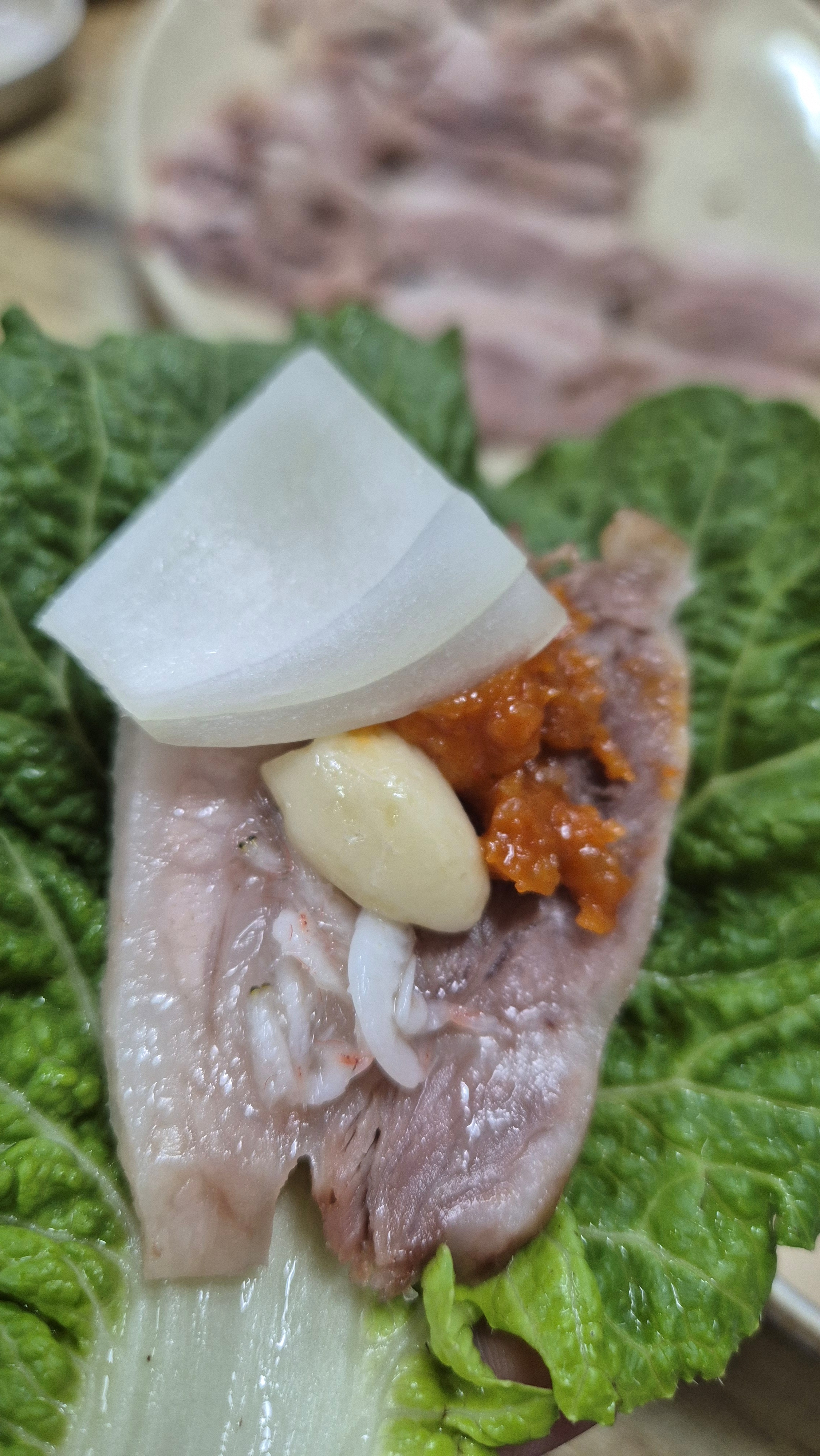 그리고, 쌈배추에 수육, 암뽕을 올리고