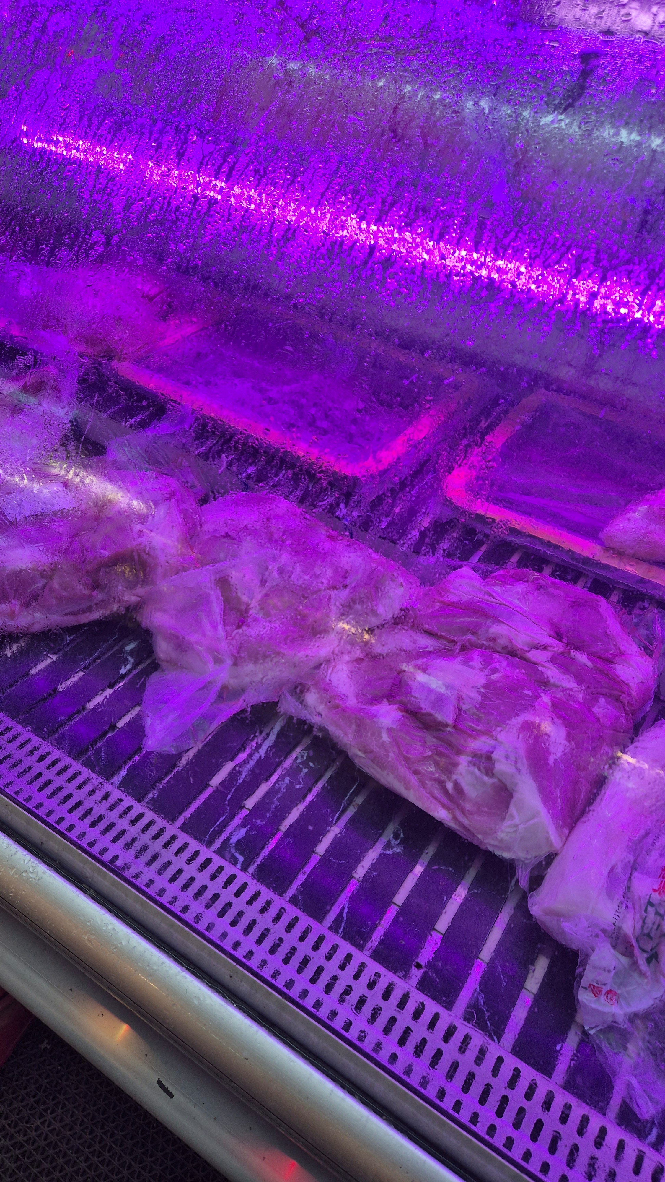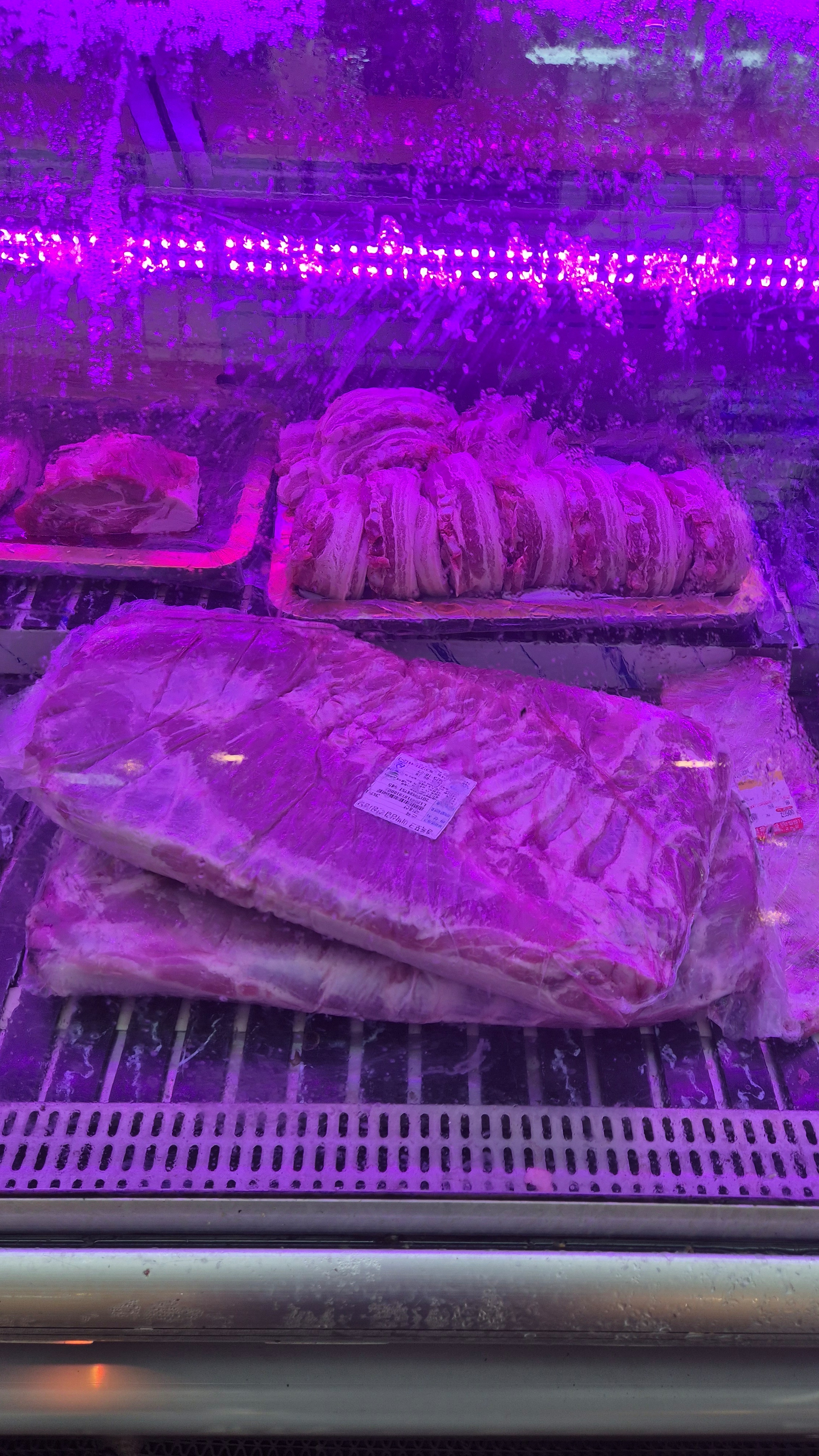 냉장 진열장 안에는 포장된 고기가 깔끔하게 보관되어 있고,