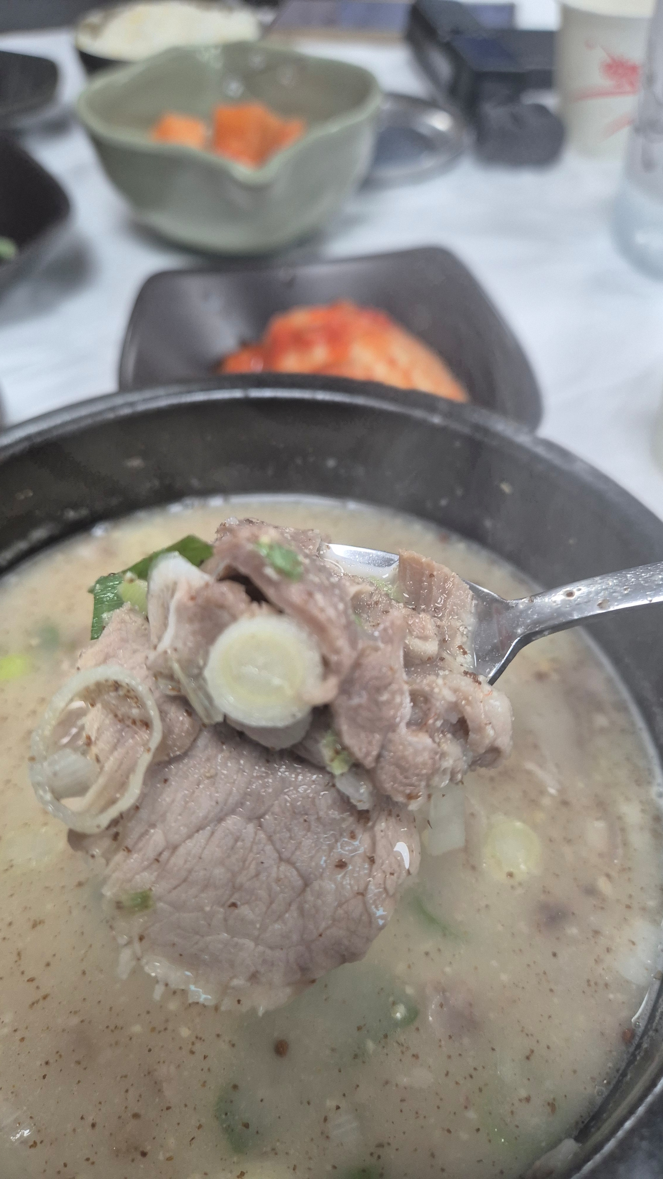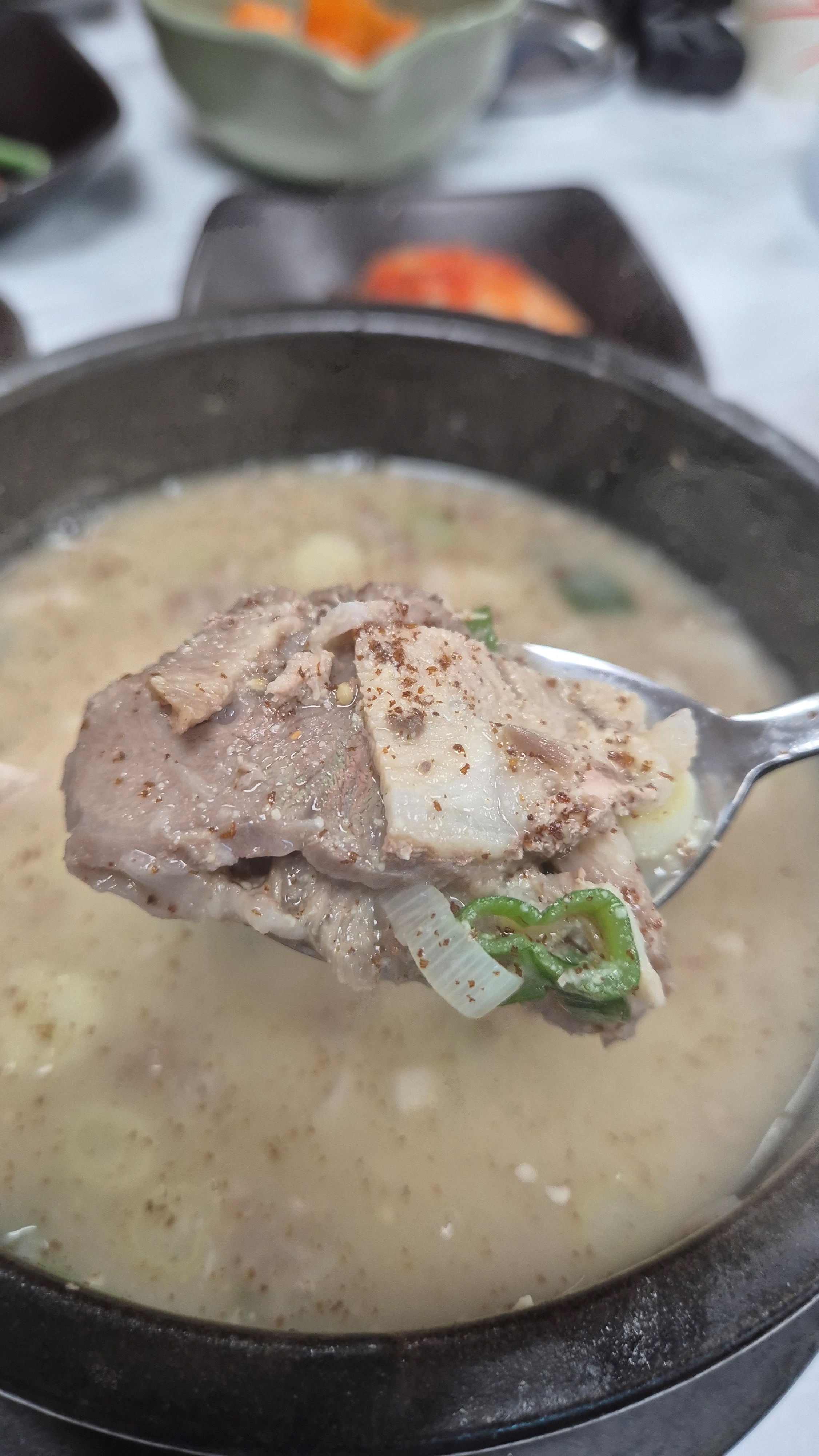 첫 숟갈에서부터 진한 국물 맛이 입안을 감싸며, 마늘의 풍미가 은은하게 퍼집니다.