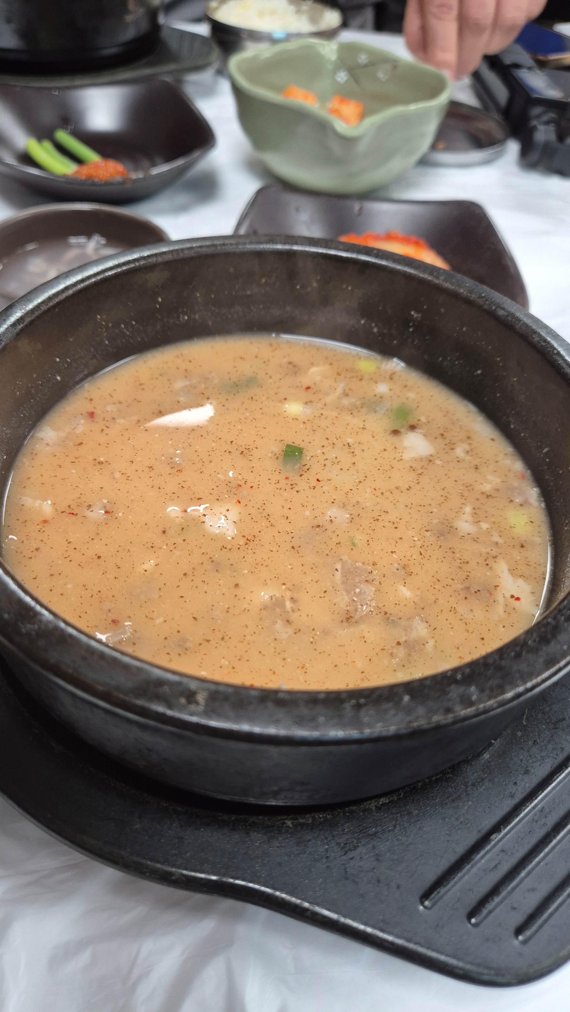 뚝배기에 담긴 국물 위로 들깨가루가 듬뿍 뿌려져 구수한 향이 퍼집니다.