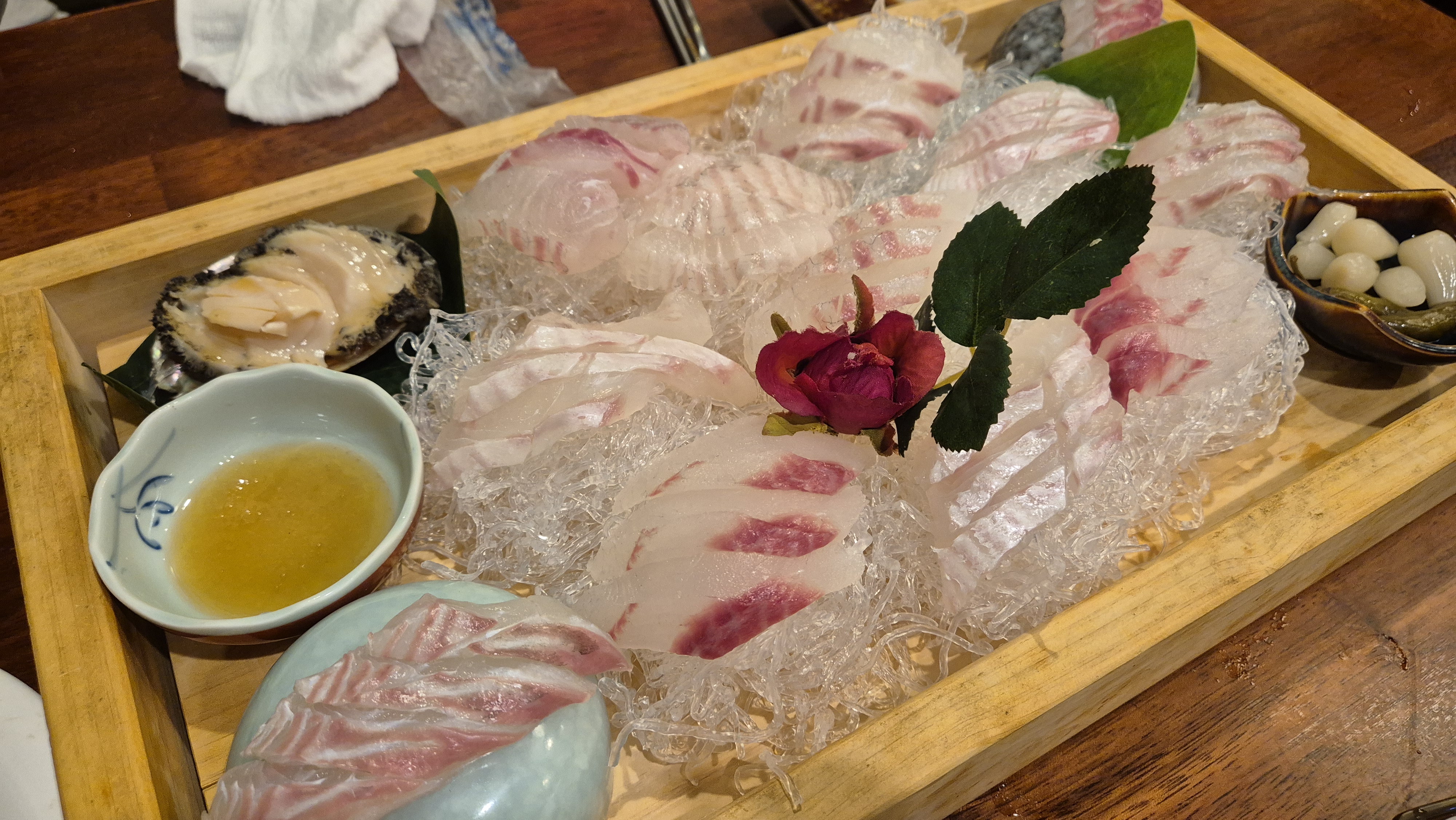 큼지막한 나무 접시에 담긴 사시미와 초밥 세트는