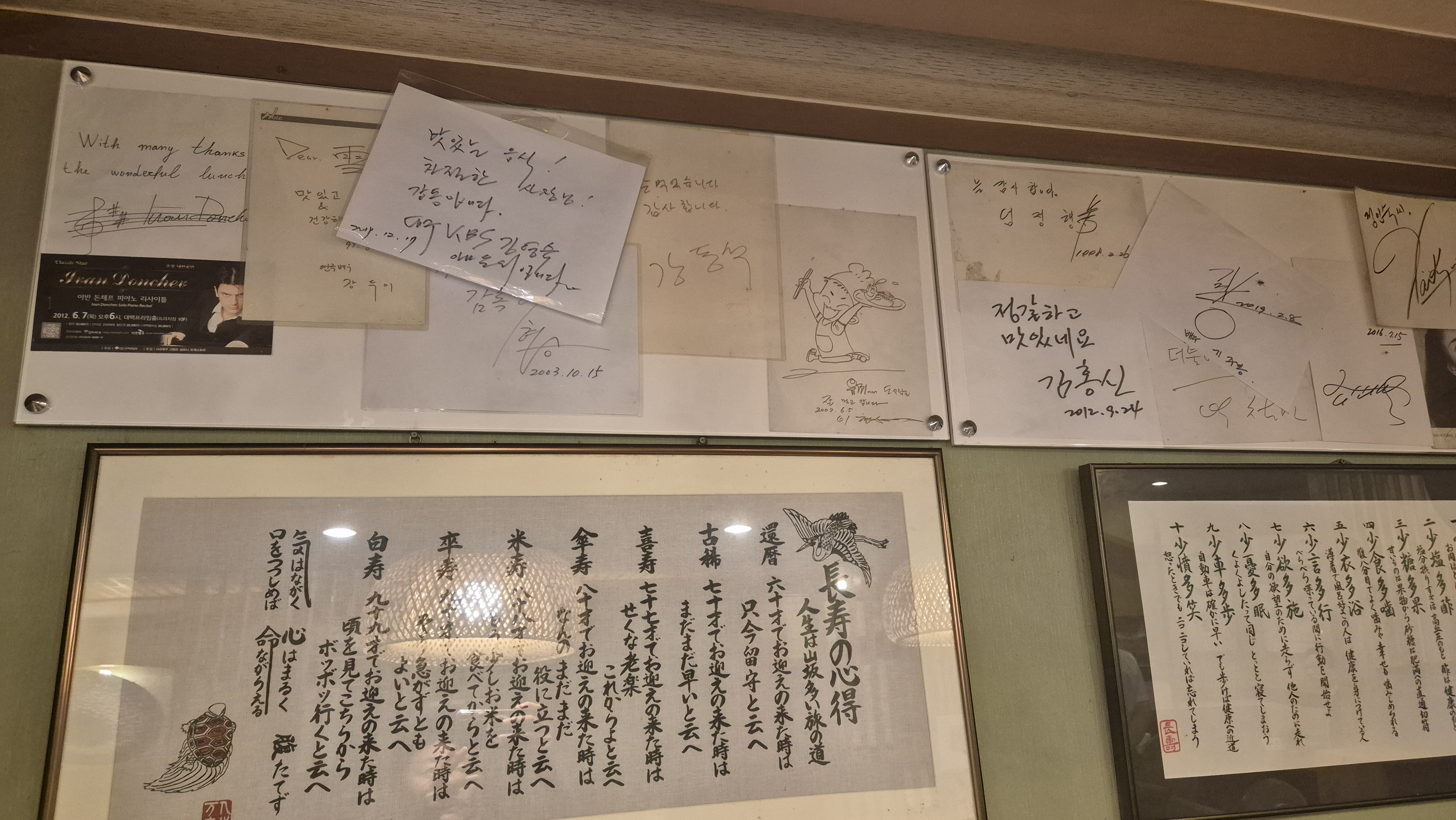 가게 벽면에는 유명 인사들의 사인(1997년도 사인 등)과 오래된 사진이 걸려 있어