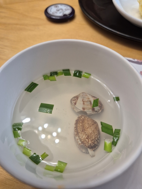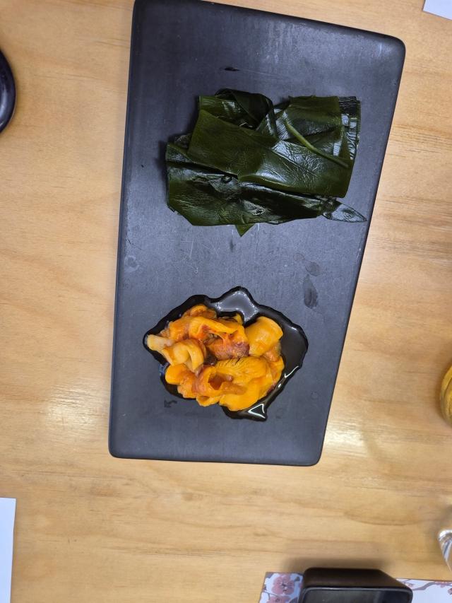 자리에 앉으면 바로 기본적인 것들과 함께 물회, 바지락국물, 김에 쌓인 알(?)밥이 먼저 세팅이 되고